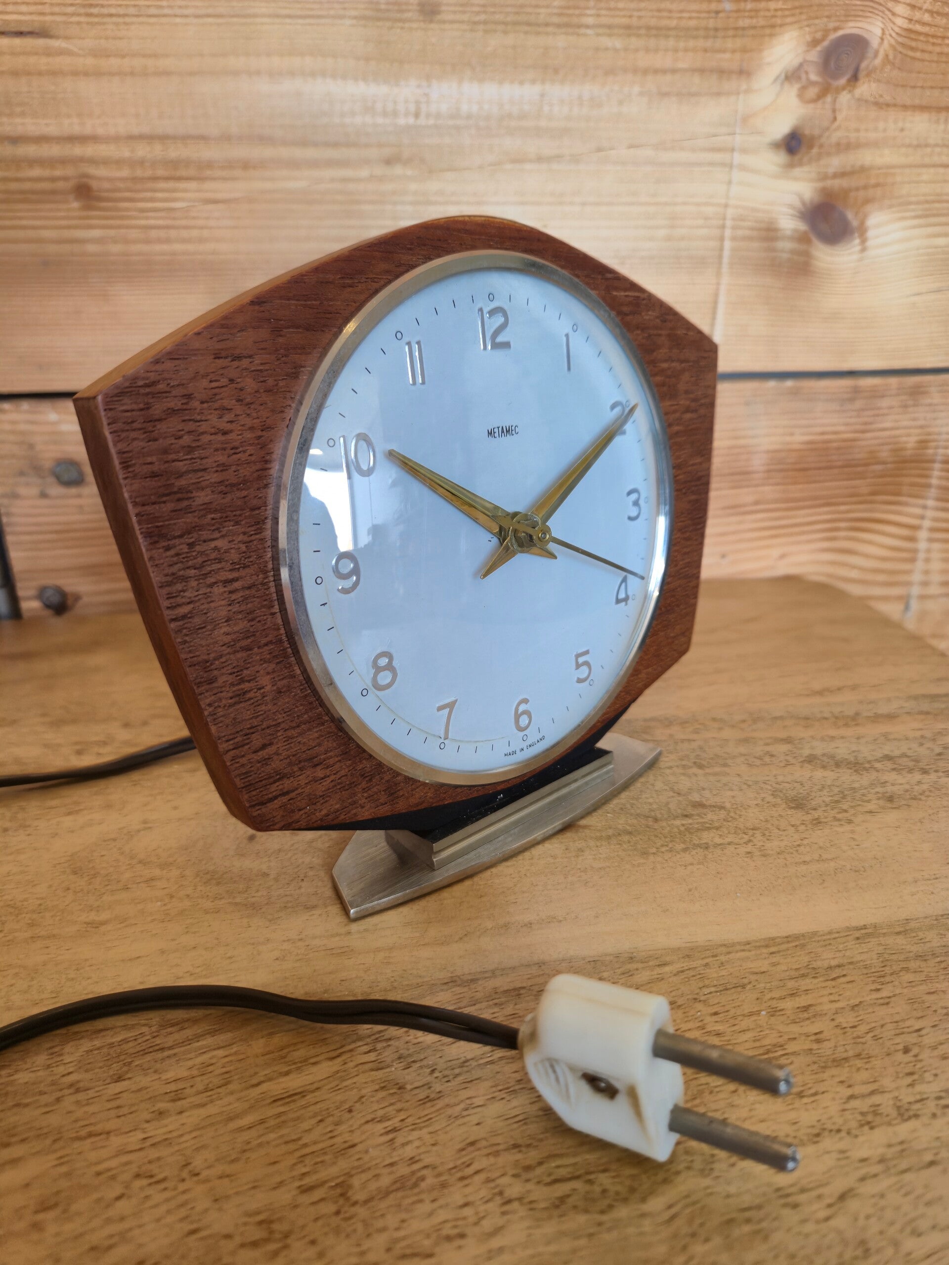 Het klokje is gemaakt door het Britse merk Metamec, bekend om zijn kwalitatieve en stijlvolle uurwerken uit de vorige eeuw. De strakke vormgeving en metalen voet geven het geheel een mooie balans tussen klassiek en modern.
